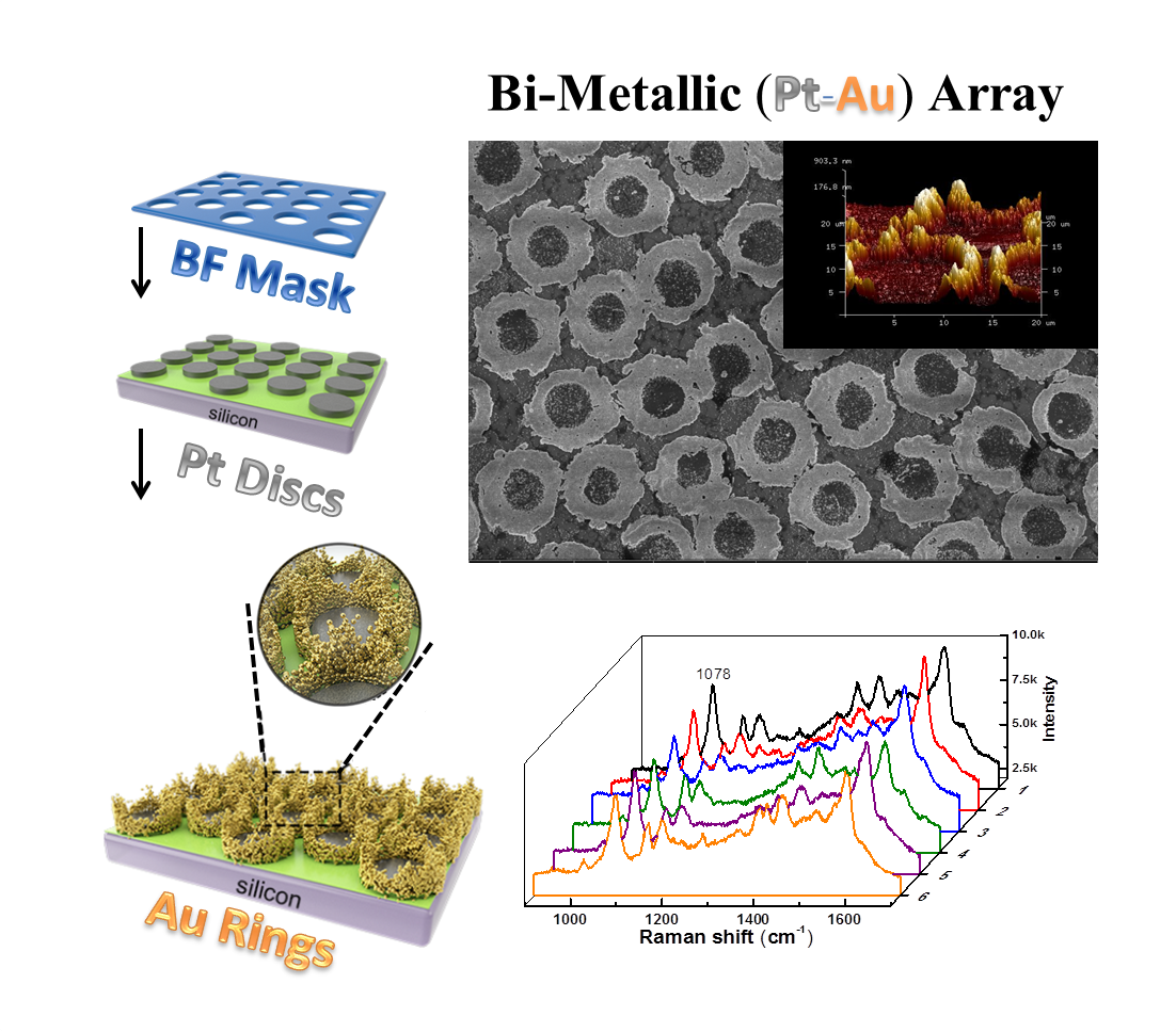 该研究提出一种创新性的模板化自组装的策略,利用自组装型的水滴模板法代替传统的光刻类技术来制备图案化模板,最终利用多步自组装方法制备得到了由双金属纳米粒子组装而成的多级图案化阵列结构,并进一步探索了这种金属阵列结构所具备的表面增强拉曼散射性质。该研究不仅为具有多级结构的纳米材料的制备方法提供了全新的思路,也进一步拓宽了水滴模板法的应用方向