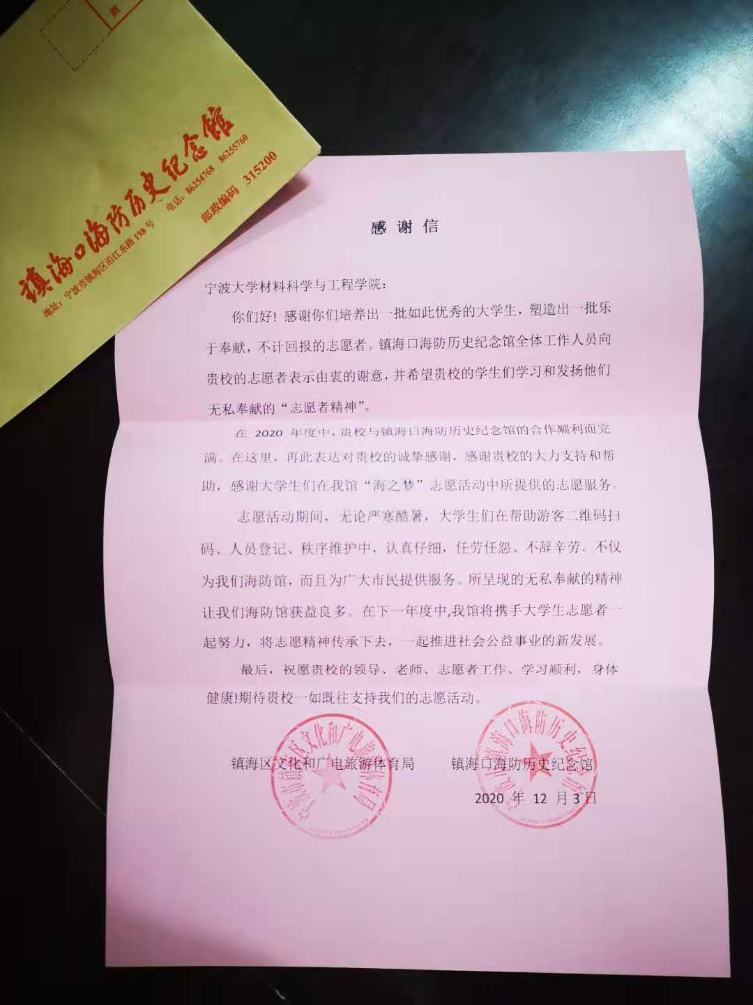 团委青年志愿者自2020年和镇海口海防历史纪念馆签订实践基地以来,小分队自疫情后每个双休日都赴基地开展志愿者服务。期间,材化青协在镇海口海防历史纪念馆“海之梦”志愿者活动中以刘佳豪同学为代表志愿服务者圆满完成志愿服务,表现优异,受到基地肯定。