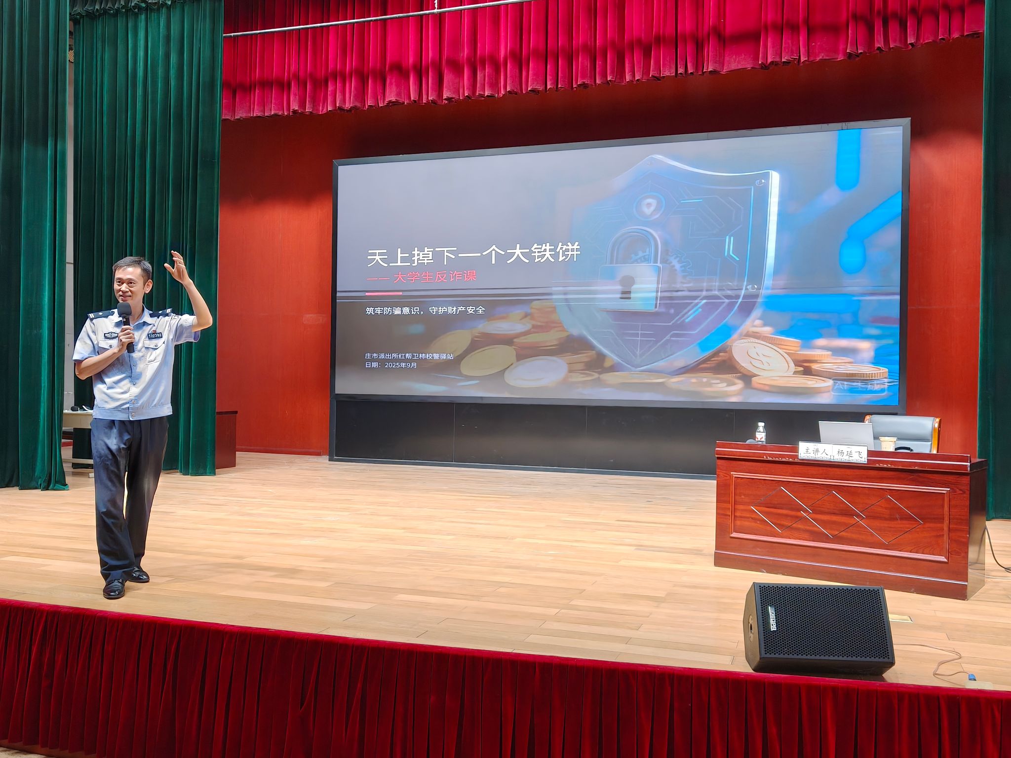 在忻元甫报告厅举办2025级研究生新生反诈宣传教育专题讲座。本次活动特邀庄市派出所副所长杨延飞担任主讲嘉宾,学院2025级全体研究生新生积极参与。