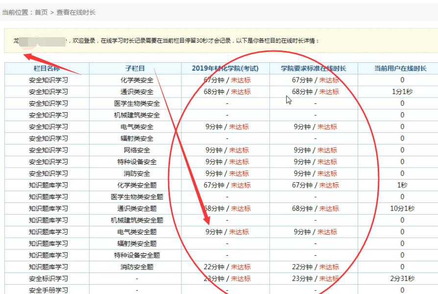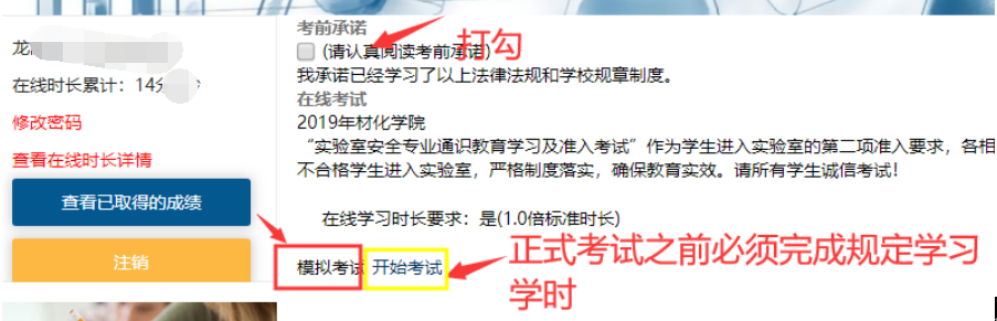 2)参加学习:点击页面右上角用户名,点击“查看在线时长” ,按照本人所在学院要求标准时长开始学习,直至各项时限要求均达标(共计8学时),方可进入下一环节参加考试。