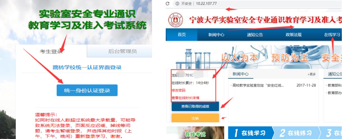 实验室安全专业通识教育学习及准入考试 / 登录 / 统一身份认证登录”,输入学号、密码进入系统。