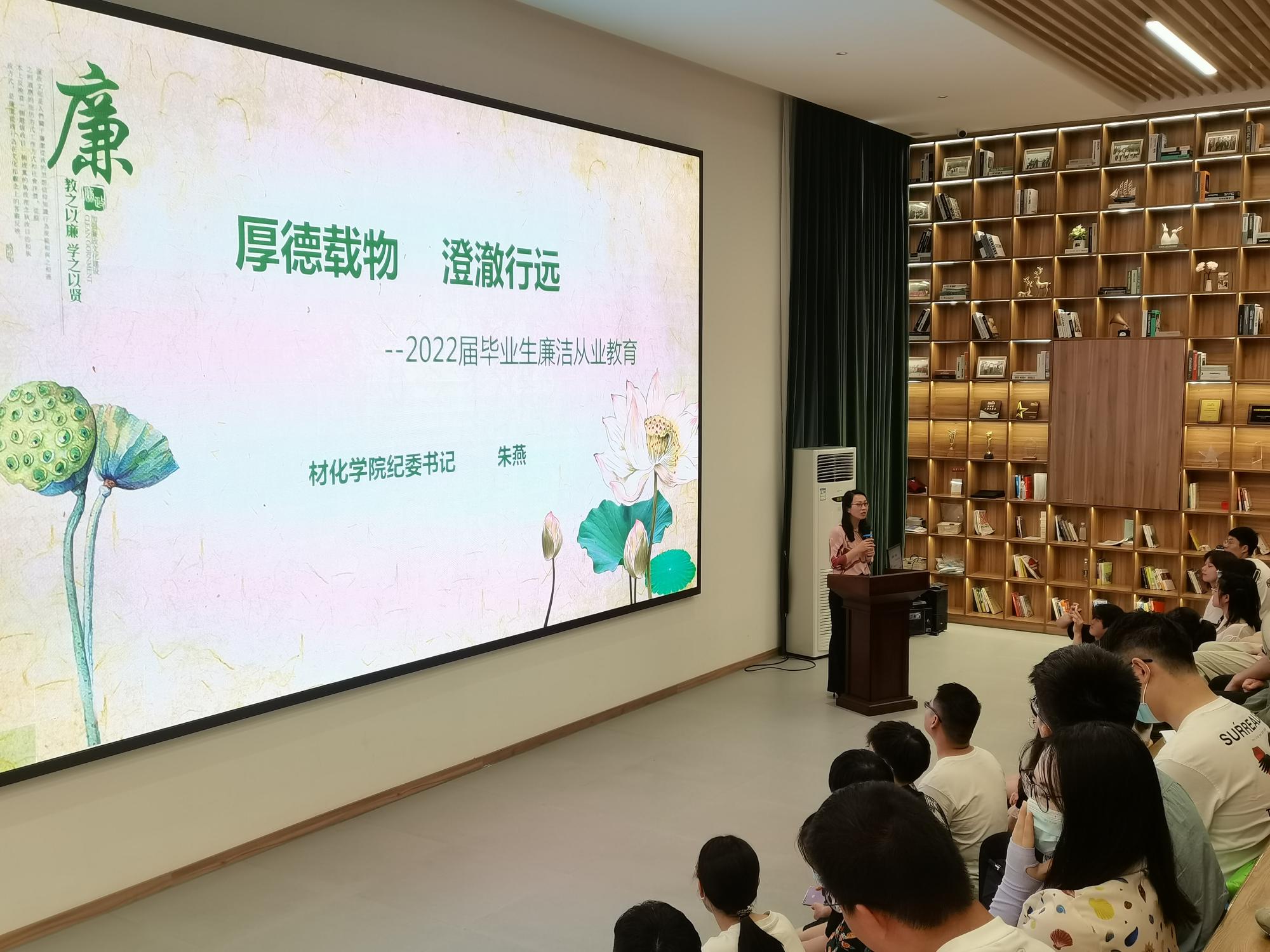2022届毕业生党员廉洁从业主题教育系列活动在云创小镇路演中心顺利开展。此次活动由学院研究生联合党支部承办,学院纪委书记朱燕、辅导员、全体毕业生党员和研究生联合党支部全体党员参加了此次主题教育活动。