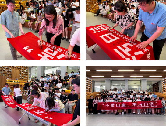 最后,全体毕业生党员们在“不受曰廉,不污曰洁”的主题横幅上签名,承诺要守住清白底线,廉洁从业。现场气氛热烈,同学们感触颇深。