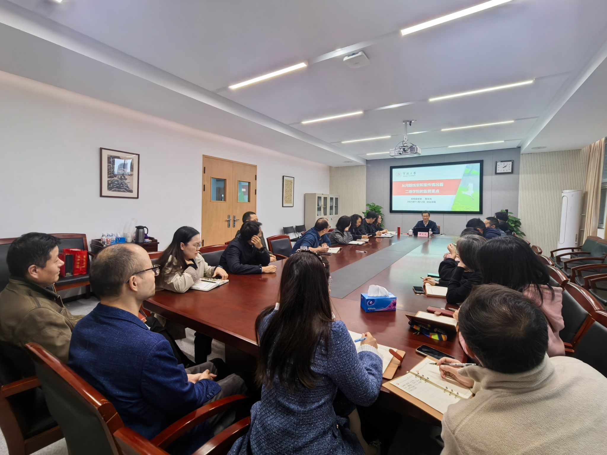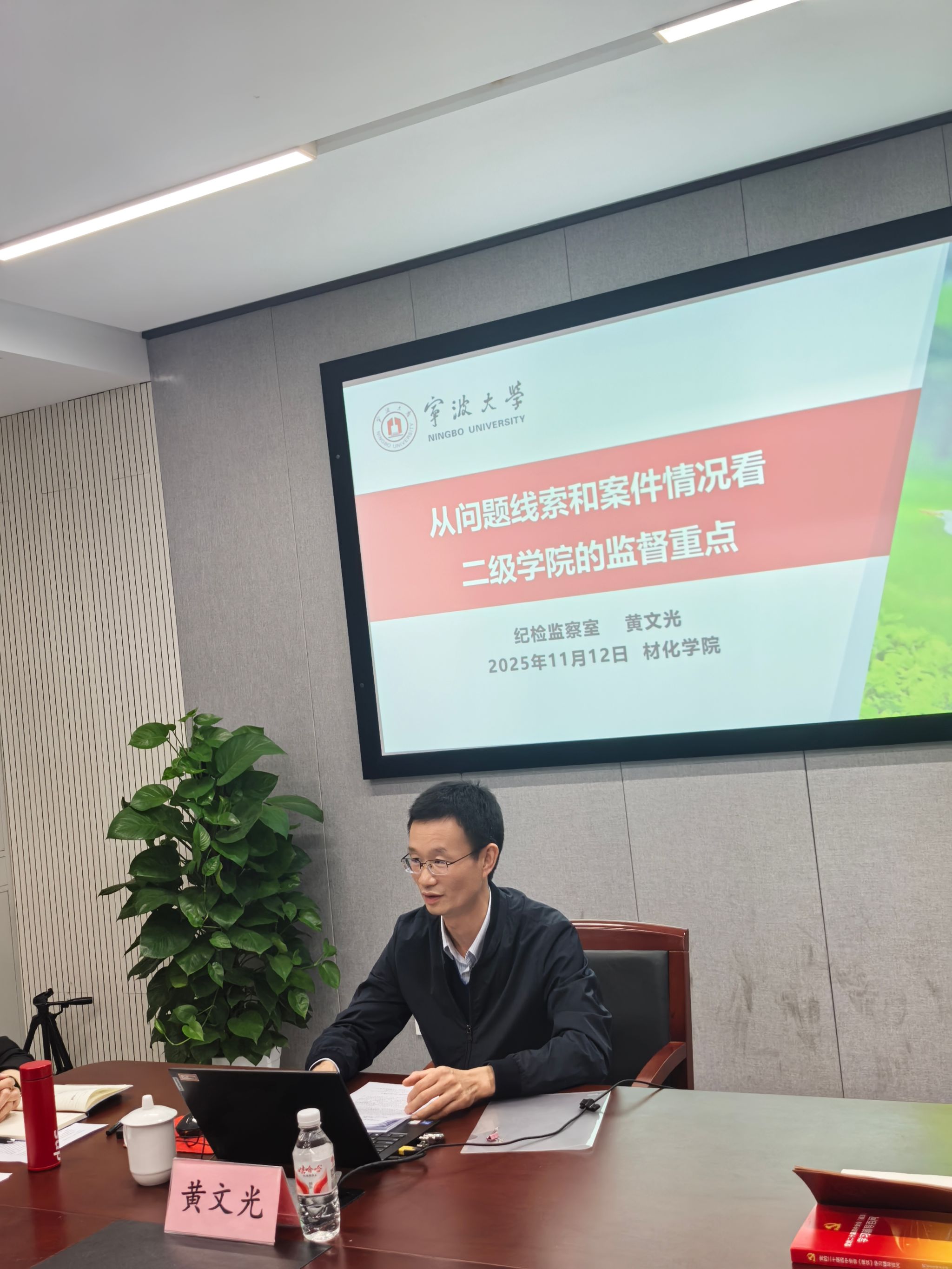 会上,尹慧代表学院对黄文光的到来表示热烈欢迎,对其带来的专业指导与经验分享致以诚挚感谢。黄文光以《从问题线索和案件情况看二级学院的监督重点》为题,围绕科研经费规范使用、杜绝违规借贷、严防酒驾醉驾、规范社会兼职、严格因私出国境管理、严禁行贿受贿行为、强化师德师风建设等关键领域,结合多起真实鲜活的典型案例,深入浅出剖析了二级学院廉政监督的重点任务、实践难点及核心风险点。