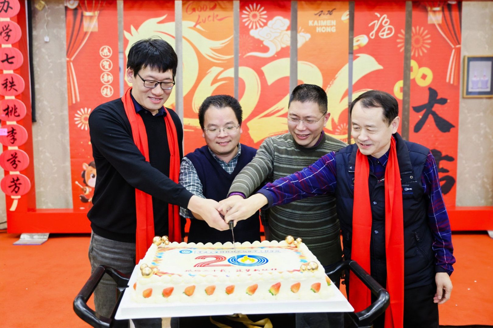 恰逢学院建院20周年,活动现场特别准备了20周年定制蛋糕,邀请在职教职工中入校最早的周雄老师、建院后第一位入职的李星老师、最新入职的彭永武老师与李砚硕院长共同执刀切分喜庆的蛋糕,象征着学院教育事业薪火相传、生生不息,也寄托了全体师生对学院20周年华诞的美好祝福和对未来发展的坚定信心。四位代表与现场教职工共同分享这份喜悦,定格下温馨感人的瞬间。