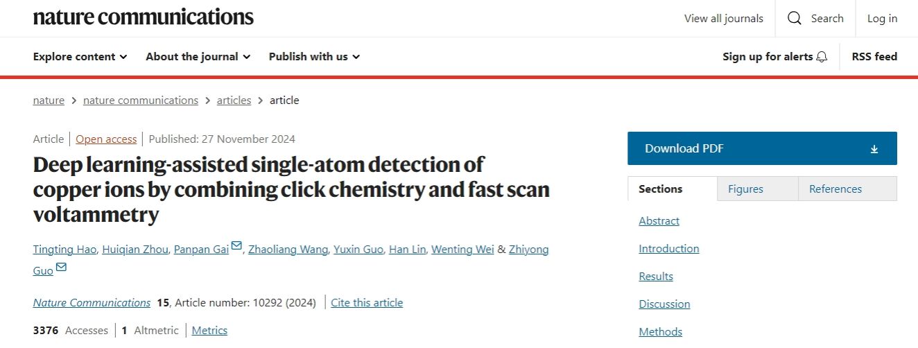 郭智勇科研团队在《自然》期刊子刊《Nature Communications》上发表了题为“Deep learning-assisted single-atom detection of copper ions by combining click chemistry and fast scan voltammetry”(深度学习辅助快速扫描伏安法检测单原子铜)的高水平研究论文。该研究首次实现了铜离子的单原子检测,为分析化学和生命科学领域提供了全新的研究思路。郝婷婷博士和研究生周会茜为共同第一作者,郭智勇教授和盖盼盼教授为共同通讯作者,51吃瓜网
