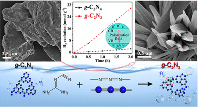 科研团队学生首次发现并设计合成出非金属半导体光催化材料石墨相C2N3,利用其自发限域极化电场促进作用,在太阳光照射下,将太阳能高效地转化为清洁能源氢能。研究结果表明,该科研团队研发的石墨相C2N3已成为至今为止转化效率最优的太阳能转化氢能非金属半导体光催化材料,为太阳能转化氢能提供了一个合适的平台,非金属半导体材料的高效、廉价的特征也为清洁能源生产与转化技术提供保障。