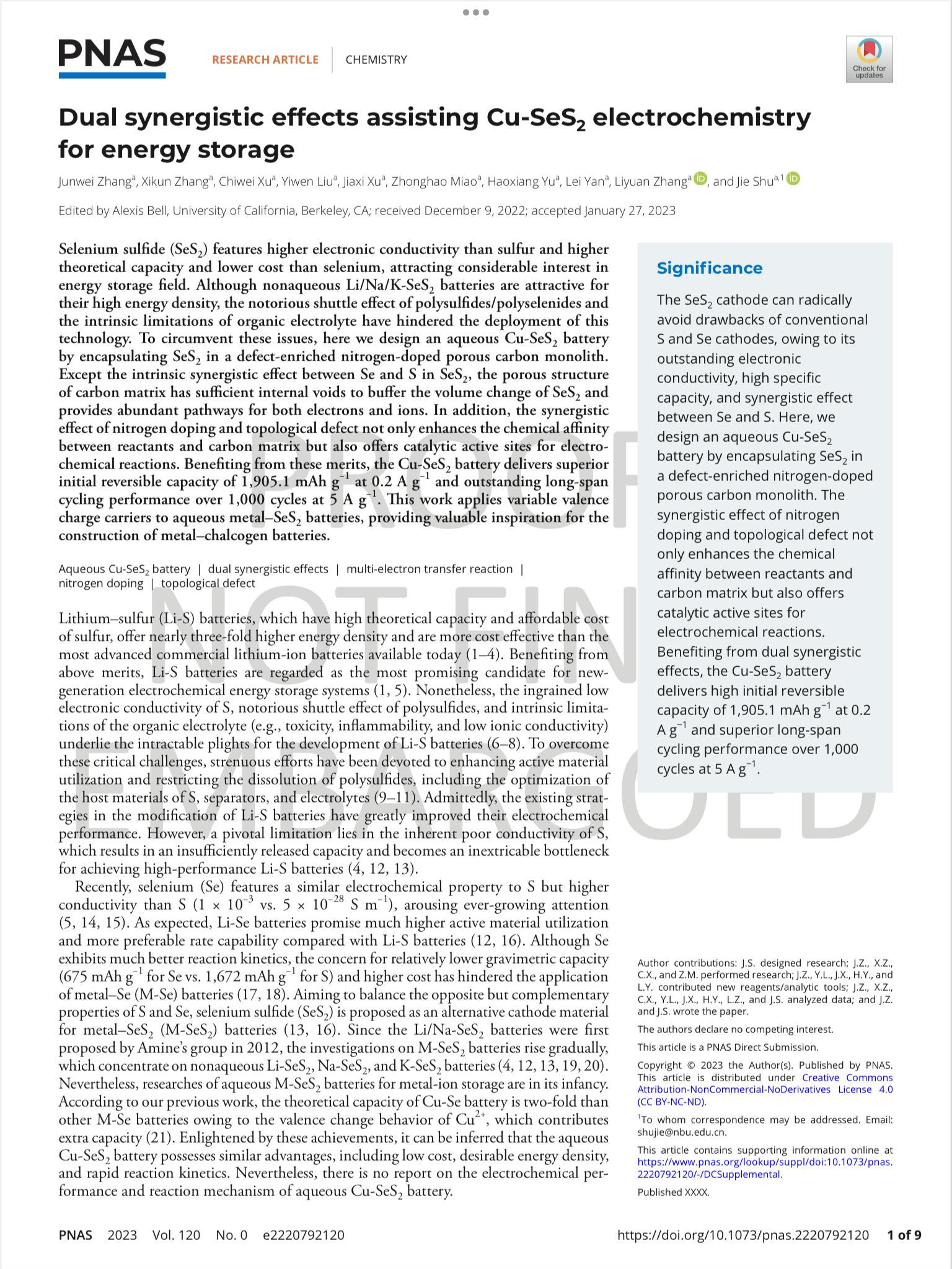 近日,我院能源化学团队针对水系硫族电池中的关键科学问题开展了前瞻性的研究,利用双协同作用提升了电极材料的可逆转化能力,进而构建了高性能的水系柔性电池,相关结果发表在美国科学院院刊PNAS上,51吃瓜网 是论文的唯一署名单位,硕士生张俊伟为第一作者,舒杰教授为通讯作者。