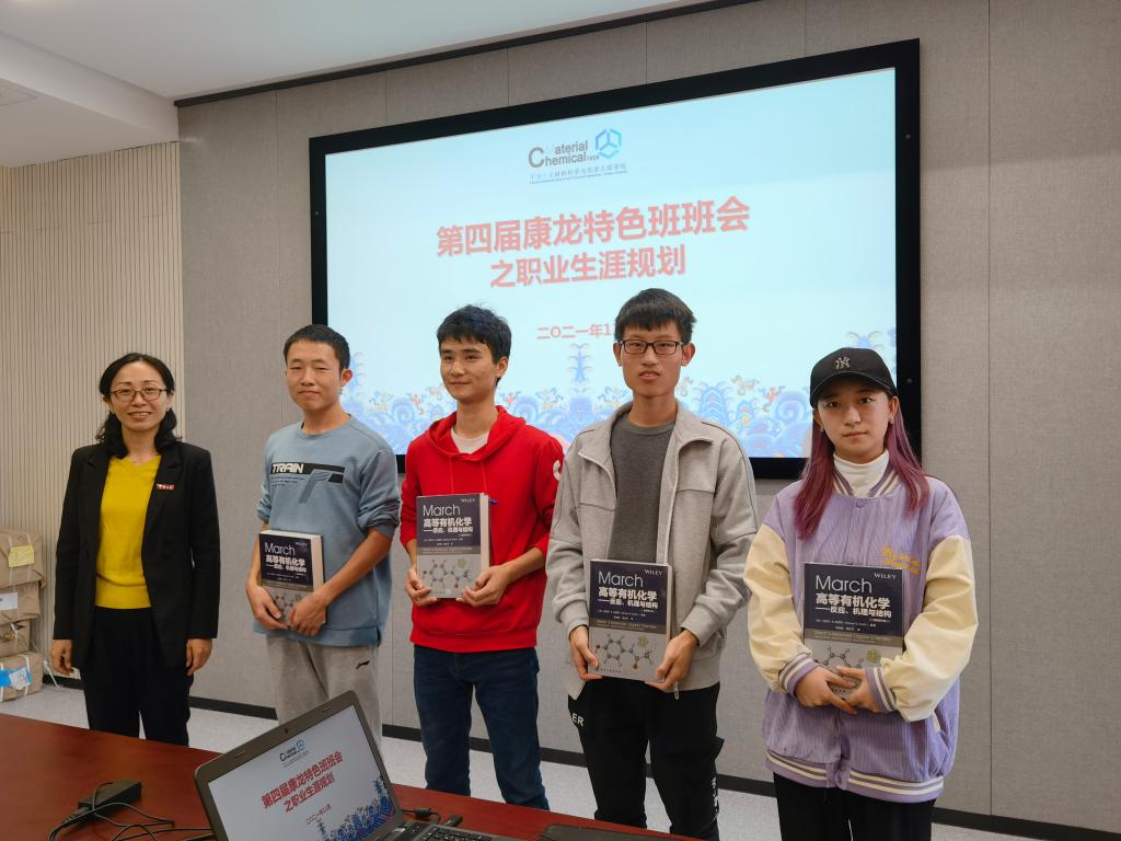 会上,朱燕老师为第三届特色班优秀成员赵子悦、胡森杰、张伟康、张军豪颁发了由康龙化成集团捐赠的书籍。