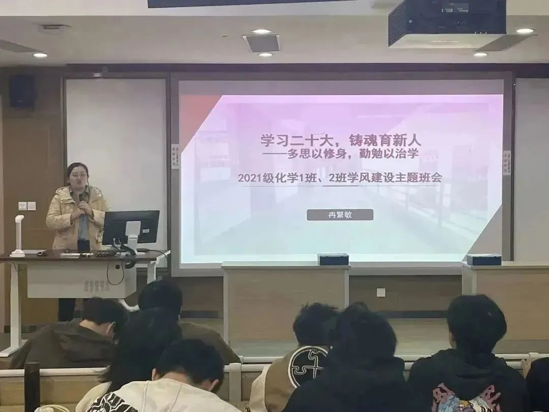 3月31日,2021级化学1班、2班在北区2号教学楼208召开题为“学习二十大,铸魂育新人——多思以修身,勤勉以治学”的主题班会,辅导员冉繁敏主持。根据前期调研,冉繁敏围绕班风、学风建设,与同学们探讨目前班风、学风存在的问题以及整改方向,结合大学生的一天情景剧,从“早起、锻炼、行动、学习、独处、负责”六个关键词出发,鼓励同学们合理规划大学生学习生活,向不良的习惯SAY NO。班会中还开展了“有机化学”分子速搭、化学版我是卧底、你“化”我猜学习游戏互动,同学们在游戏的欢乐和比拼的紧张中再次领略化学魅力。最后,基于前期学风调研,班会成立了“救救我的作业吧”、“快起床运动吧”、“出门晒太阳吧”、“一起考研准备吧”交流群,帮助同学们互促互进。此次班会针对学风建设中的痛点难点问题,通过和专业紧密结合的生动的活动形式,营造了学风建设的良好氛围,同学们纷纷表示“这一场互动满满的班会收获了满满的能量和动力。”