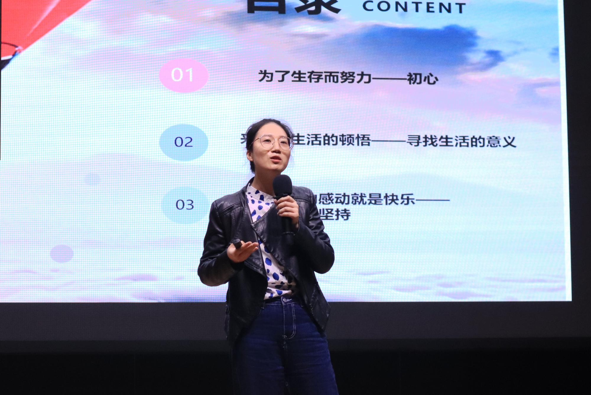 季碧芳讲述自身的成长经历,从为了生存而努力的求学求职生涯,到工作后的迷茫、对生活意义的追寻,到参加公益活动后让自己的理想发光,用爱的力量帮助更多人,从中收获自身的成长,在自我实现中获得幸福感和价值感。她以“再大的雪压不住来年的竹”自勉,并告诫同学们要不怕吃苦,敢于坚持,“生活不一定精彩,却一定要有爱”。