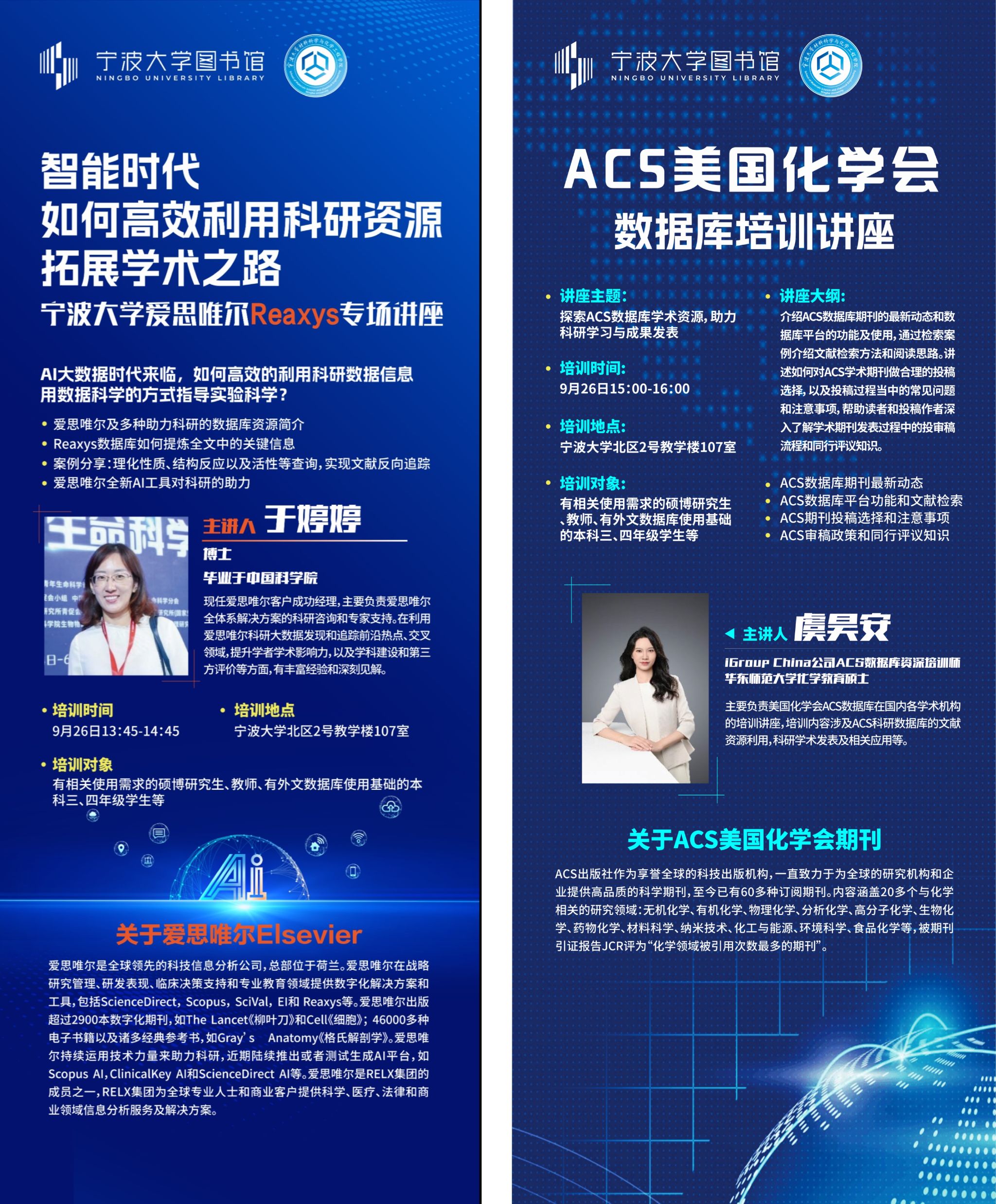 为了提升科研效率,增强文献检索与数据分析能力,学校图书馆特邀请两位领域内的专家为大家进行爱思唯尔Reaxys和美国化学学会(ACS)数据库的使用技巧培训,请我院的各位老师和研究生积极参加: