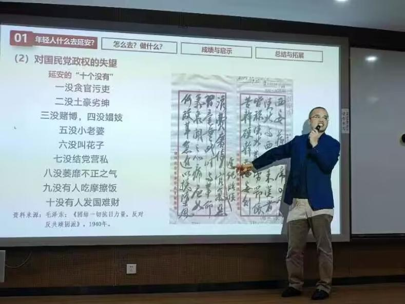 马克思主义学院副教授郑善庆通过老兵之口和历史文献,解答了“年轻人为什么去延安”、“怎么去延安”和“去延安做什么”三个问题,同时结合宁波地区革命根据地的发展情况,叙说宁波地区老一辈革命英雄故事,向同学们全面讲述了党的执政地位的取得,源于历史的选择和人民的拥护。
